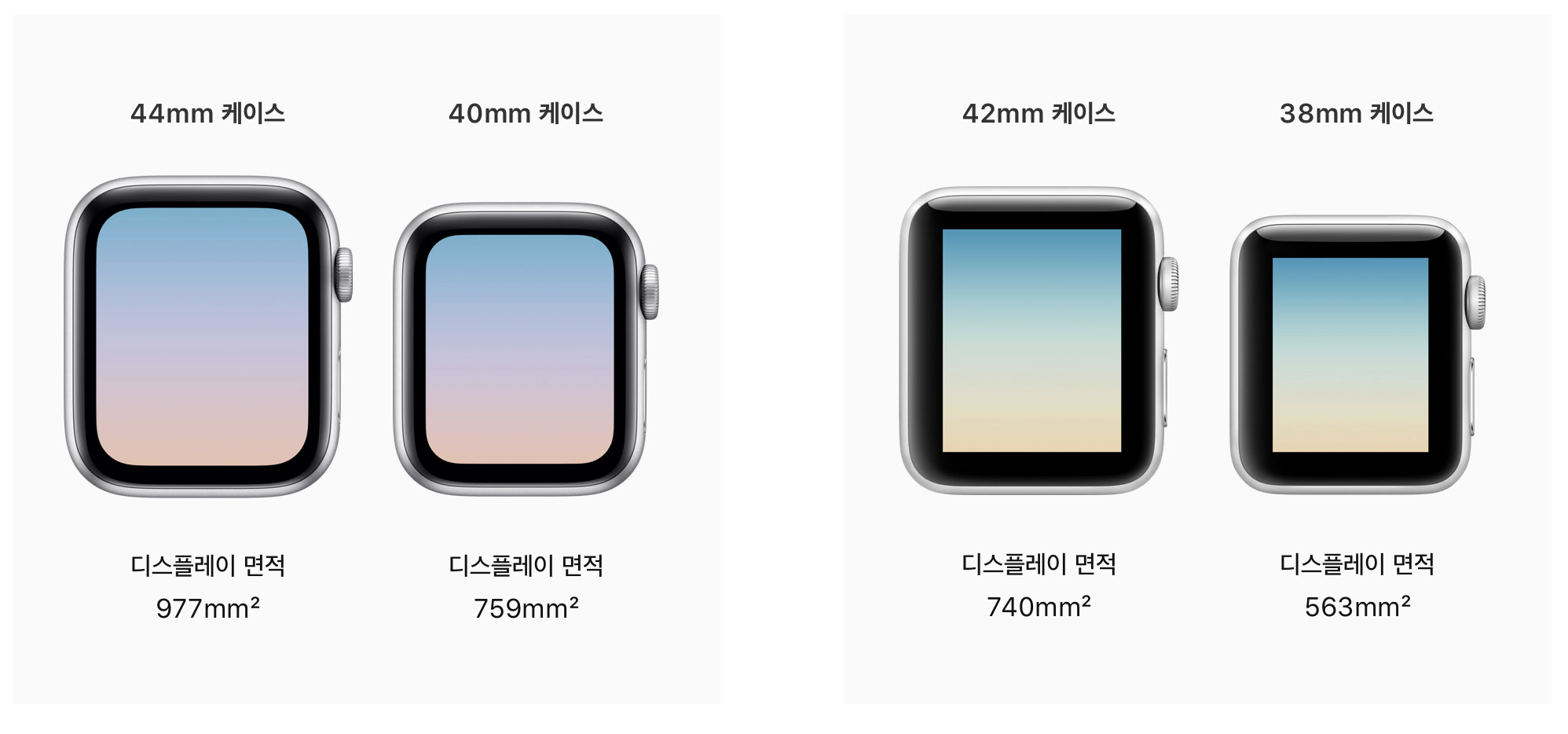 애플워치 시리즈4부터 변경된 디스플레이와 동일하게 시리즈5에서도 동일하게 44mm와 40mm 사이즈를 선택할 수 있게 됐습니다.